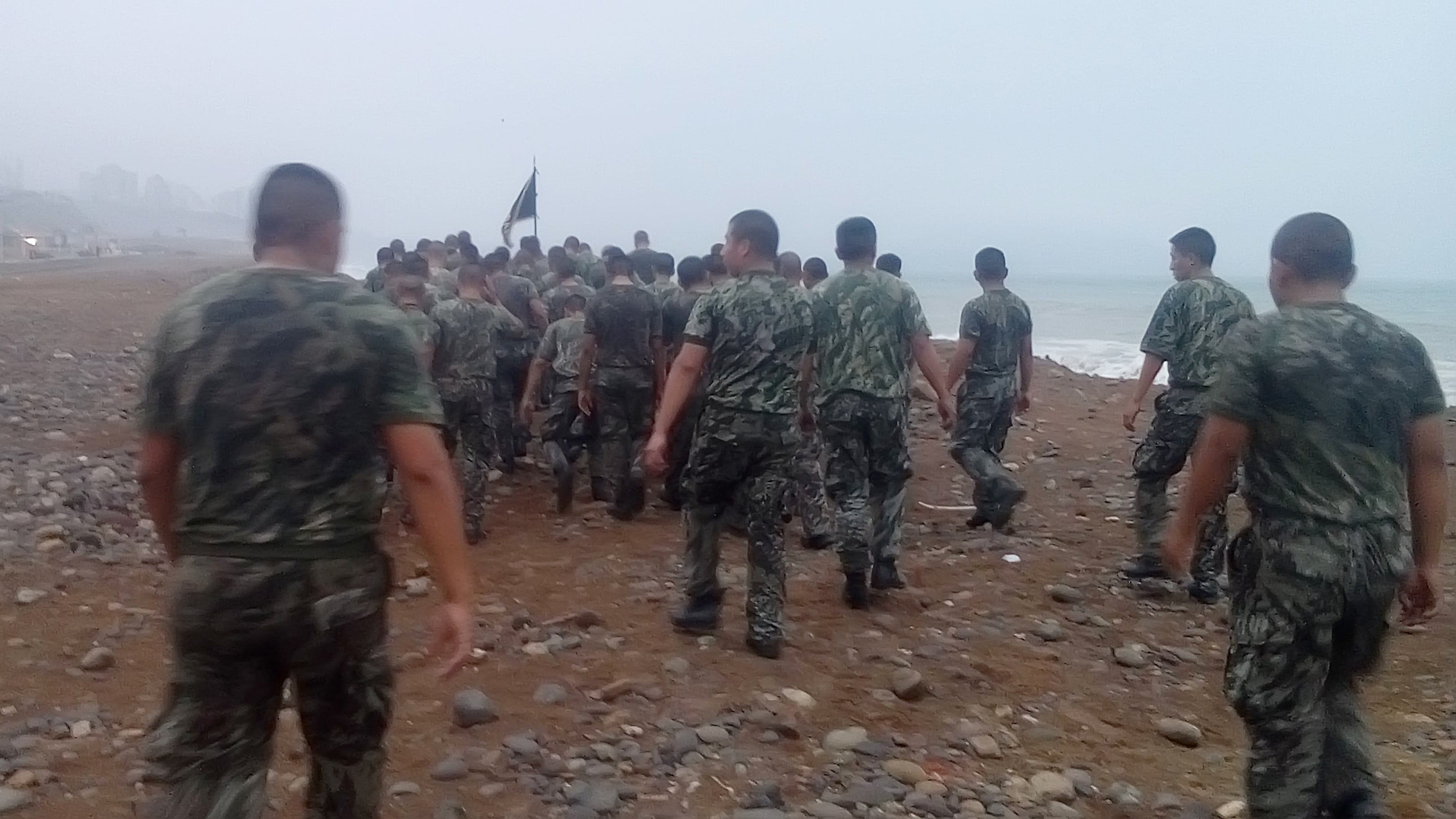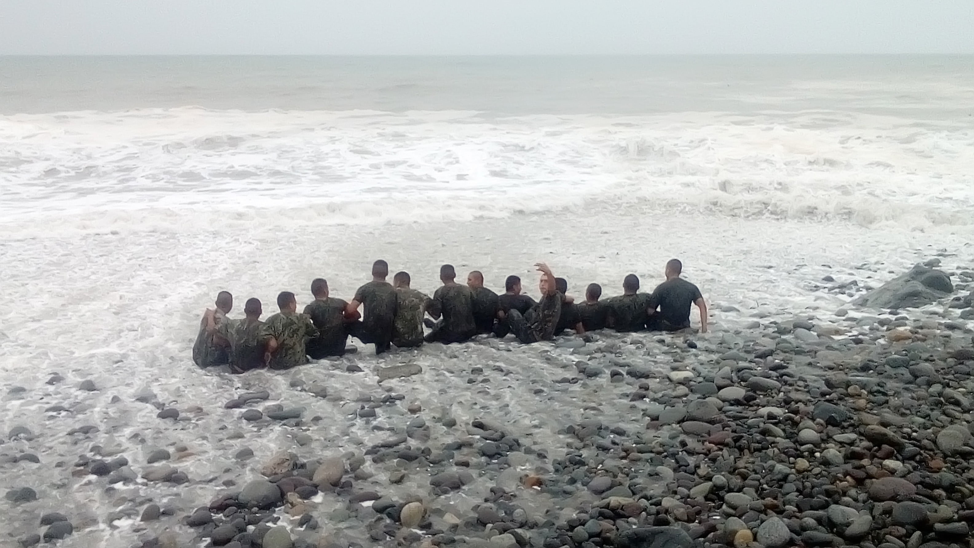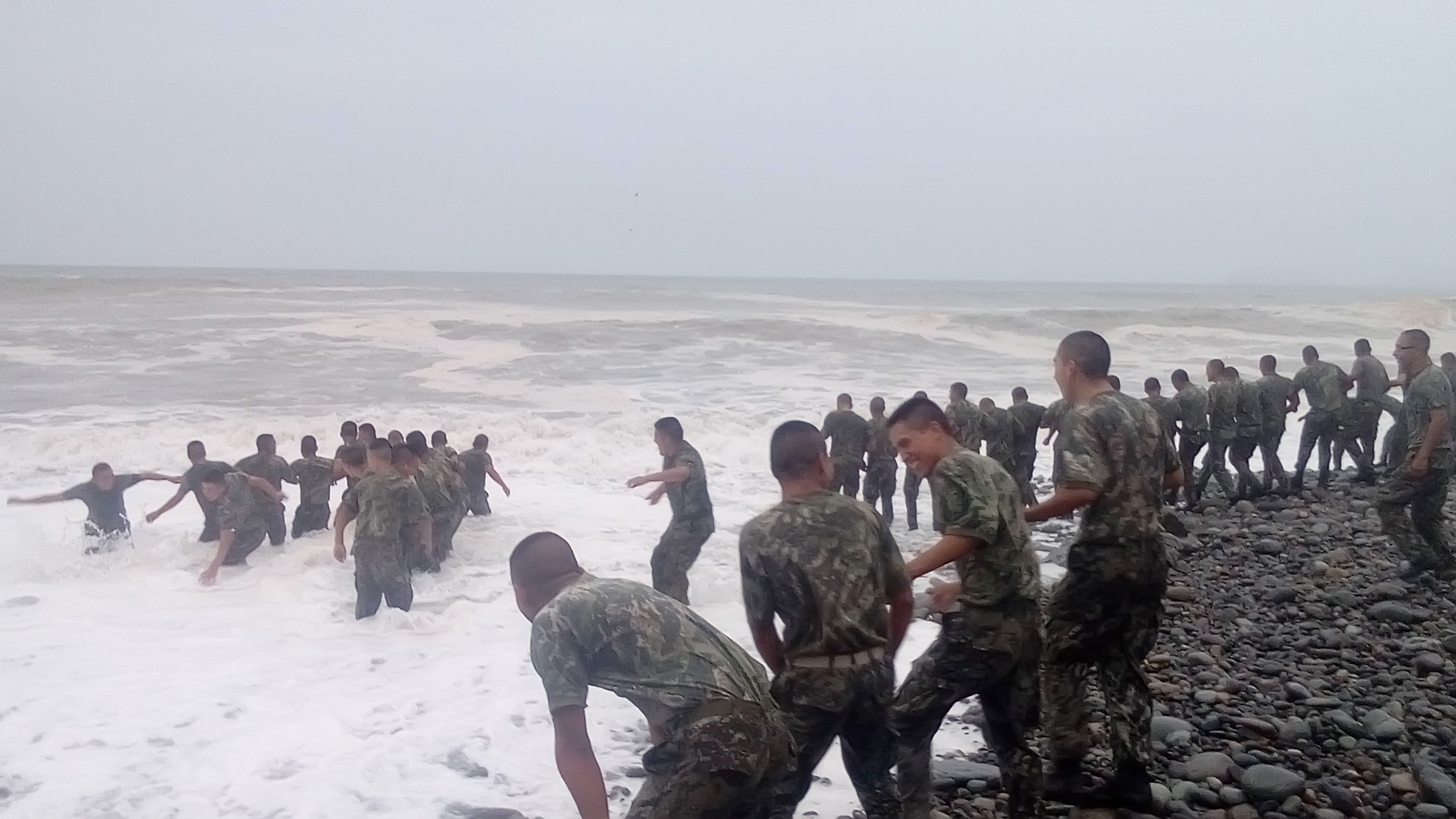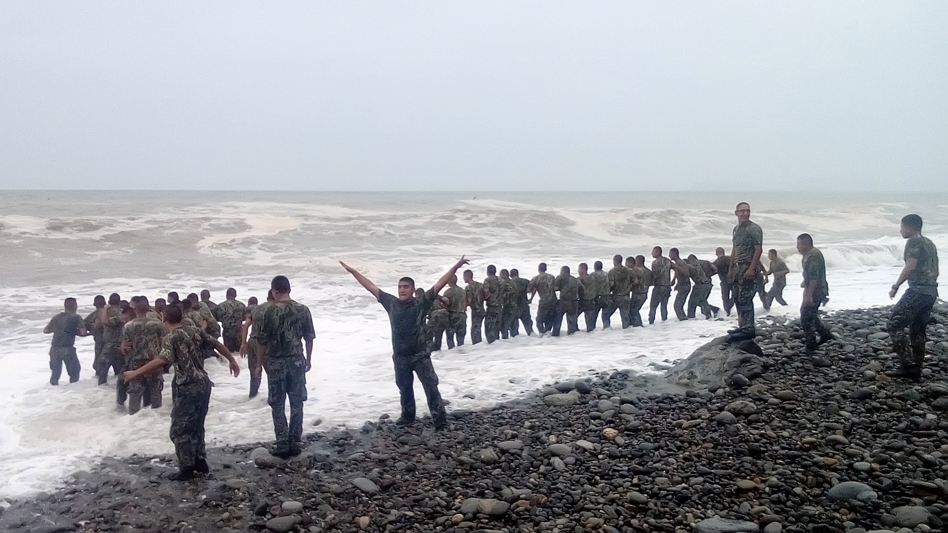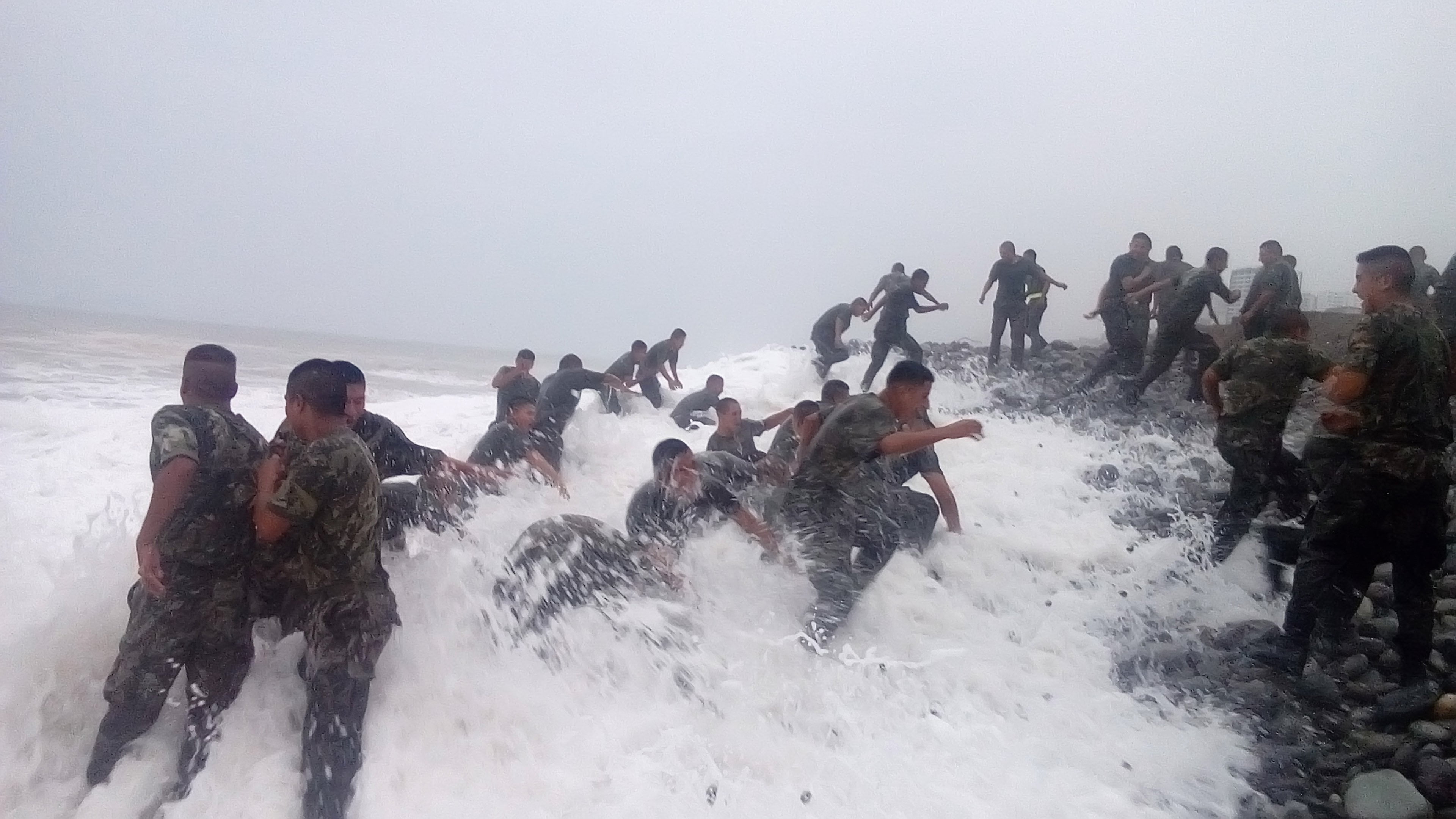 En las imágenes se observa luego como los soldados llegan hasta el mar y se reúnen en grupos de 15 a 20 personas, todos cogidos de los brazos soportando la llegada de las aguas.
